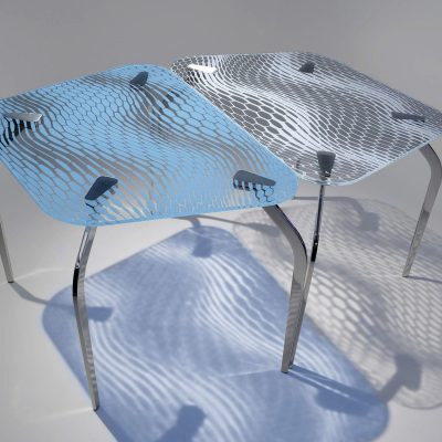Colpito dalla luce, Mira Table crea meravigliosi effetti cromatici, creando un dinamismo di proiezioni.