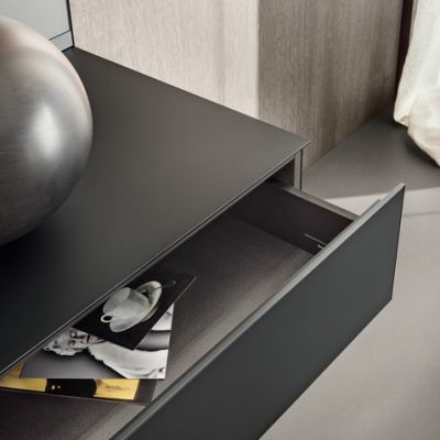 Il progetto si compone di una boiserie di vetro laccato, superficie pura che vive di luce e riflessi, in cui si innestano contenitori interamente in vetro con cassetti e con ante scorrevoli, mensole di sottilissimo spessore e vetrine con ante a ribalta.