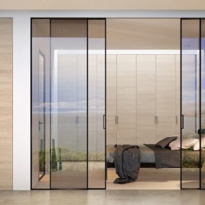 In foto: Porta Filomuro Bisystem in vetro fumè e profilo nero + Armadio Miria