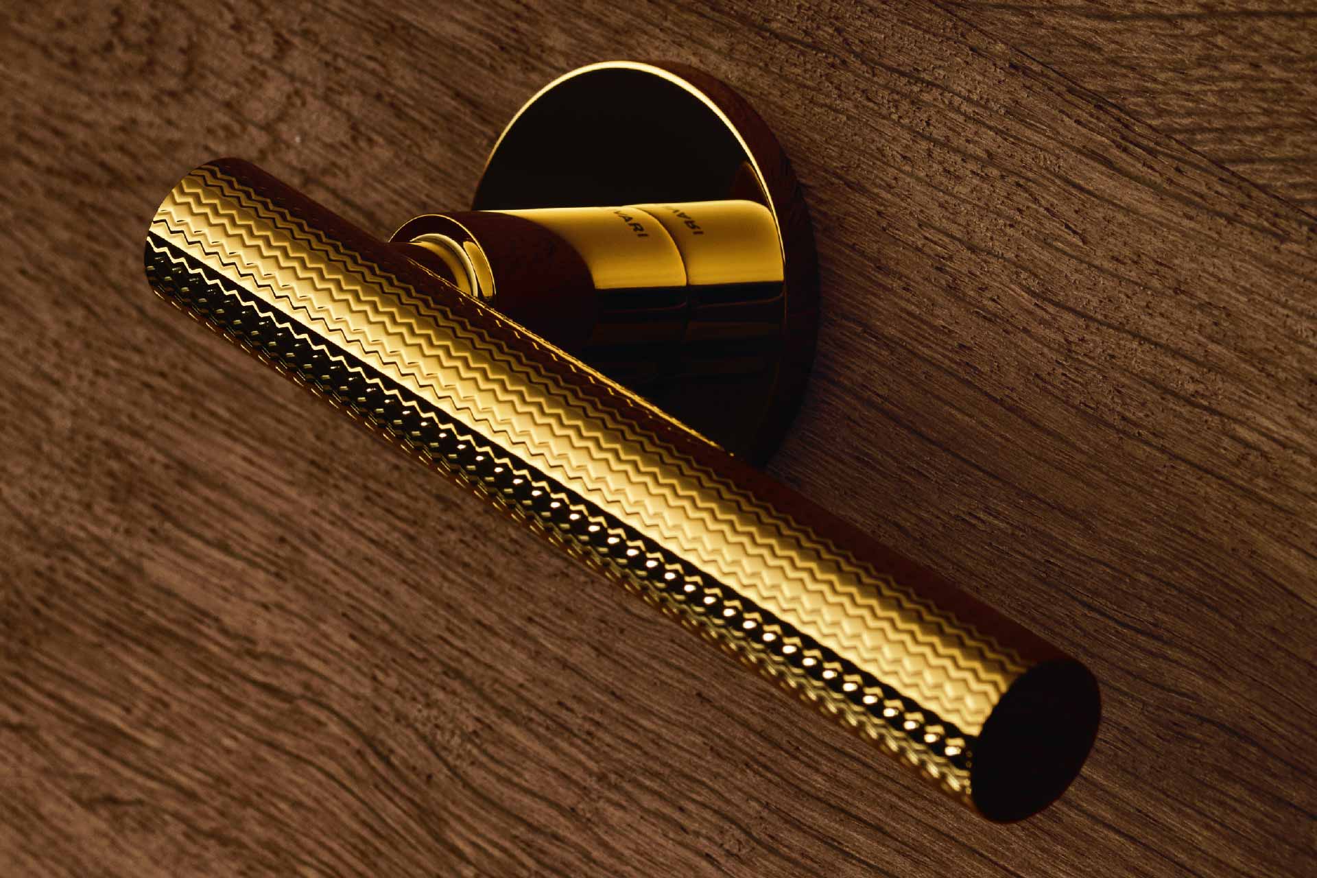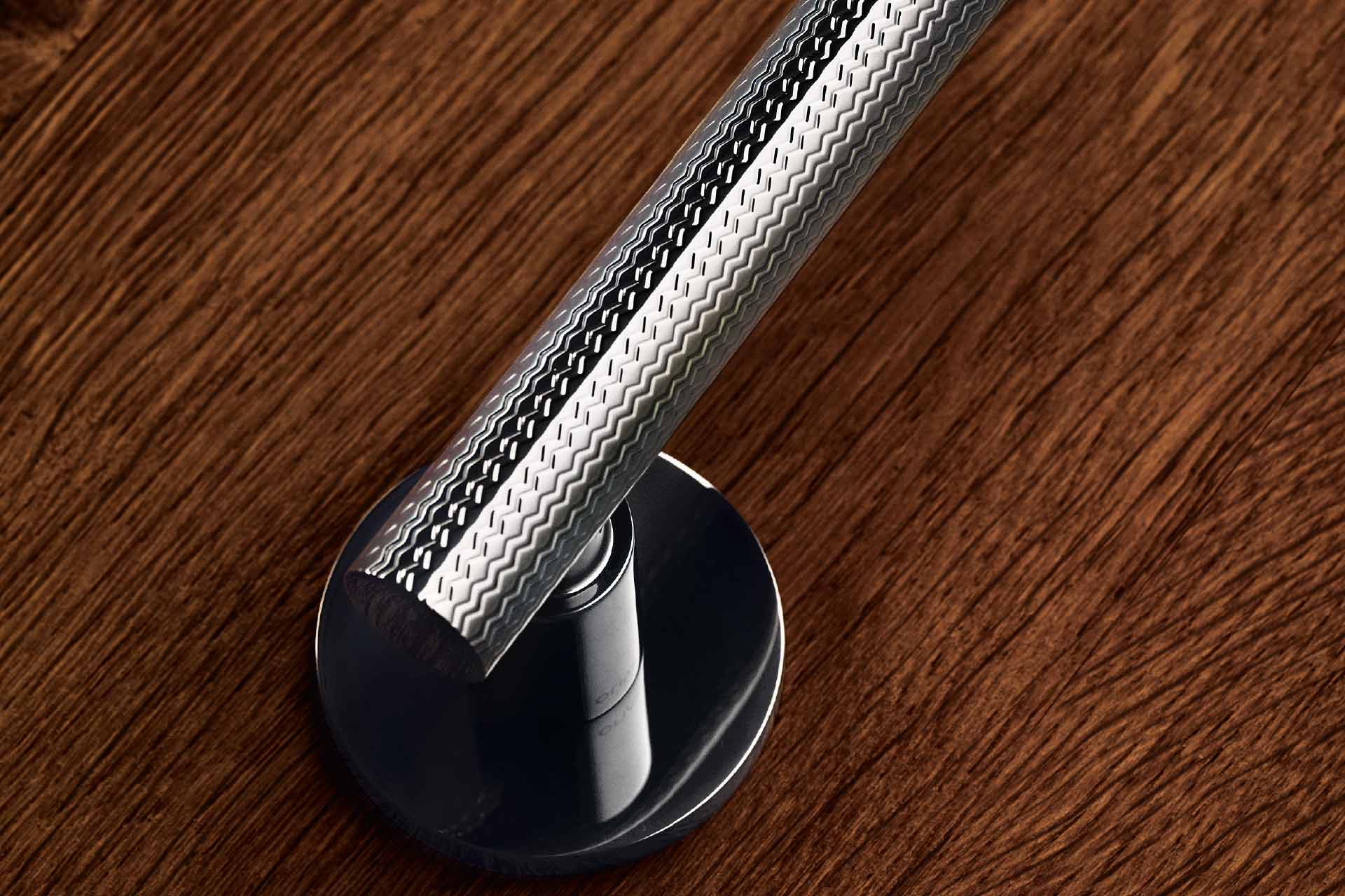 La decorazione Rank riprende il classico motivo “a onda” della tradizione guilloché che ben si sposa con la purezza geometrica del cilindro creando riflessi di forte carattere.