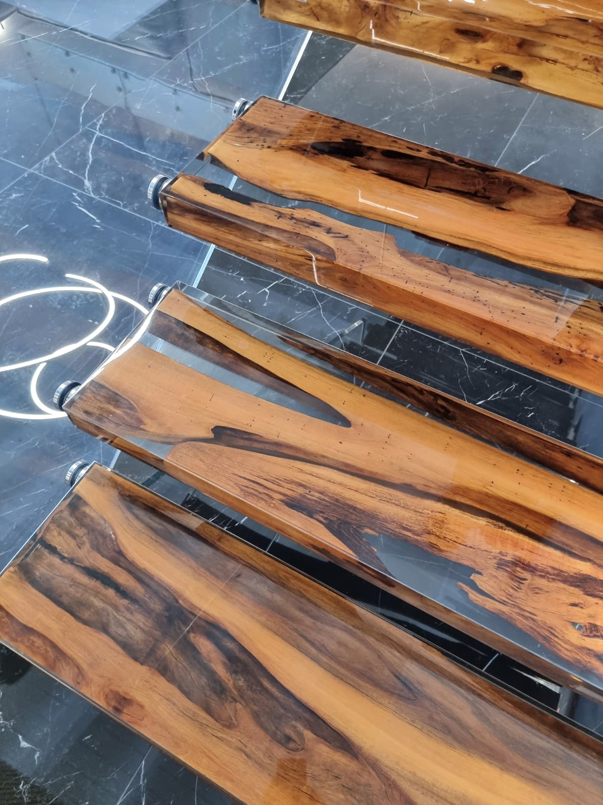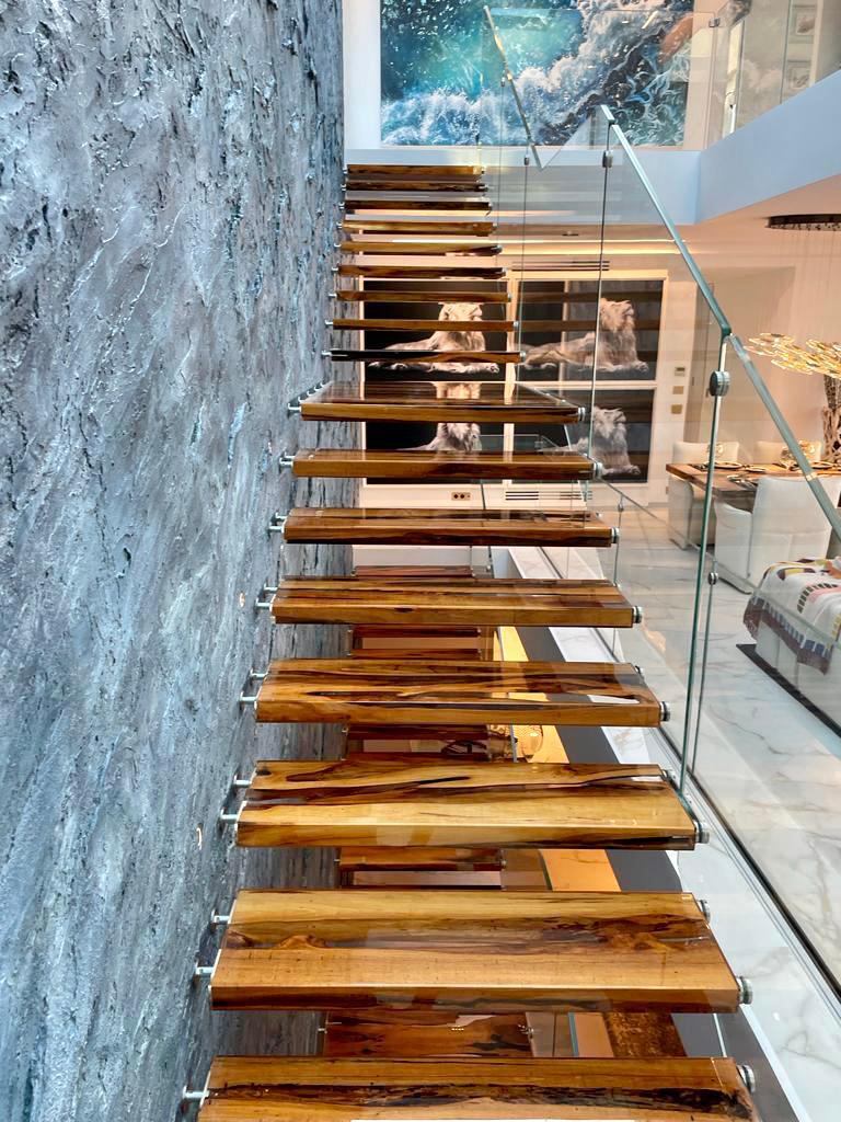 Sempre alla ricerca di nuove soluzioni di design, presentiamo la scala per interni, su misura realizzata con gradini in legno Carapanauba e resina.