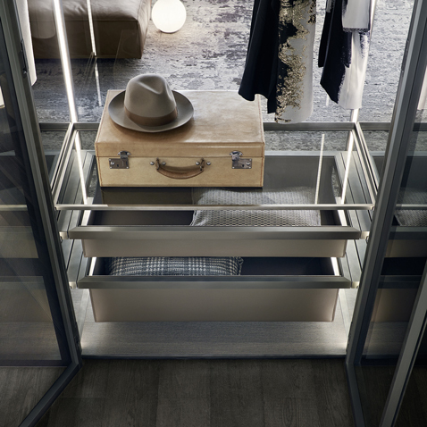 Cover FreeStanding è un sistema di contenitori con struttura in alluminio e ante, fianchi e schienali in vetro.
