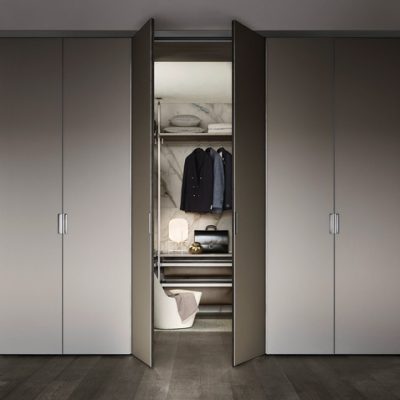 In foto: struttura in piombo spazzolato, ante, spalle e schienale in vetro trasparente grigio