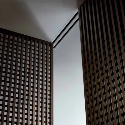 Una soluzione antica, reinterpretata da Rimadesio attraverso l’incrocio tra le nervature verticali in alluminio e la decorazione a linee orizzontali