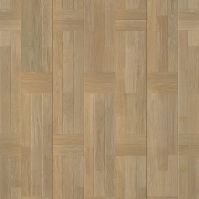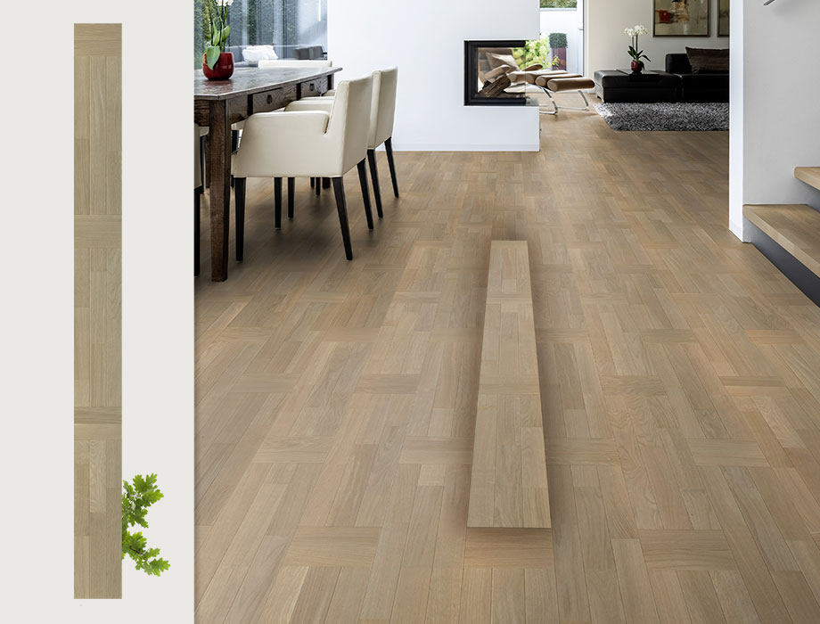Anche nel parquet con motivo intrecciato viene impiegata la tecnica Contours per mettere in risalto il carattere multistripe unico.