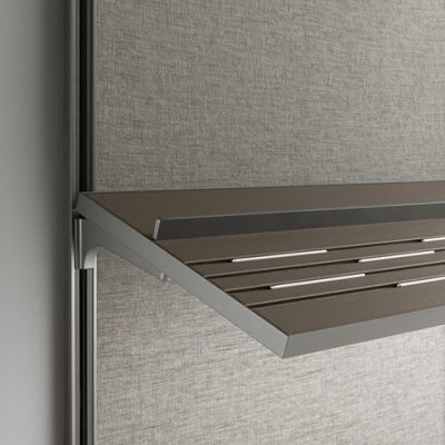 Gli accessori, liberamente posizionabili lungo il montante a parete, grazie al sistema brevettato di fissaggio ad espansione senza fori, comprendono: mensole e basamenti, aste portabiti, appendiabiti inclinabile, cassettiere, portapantaloni e vassoi estraibili.