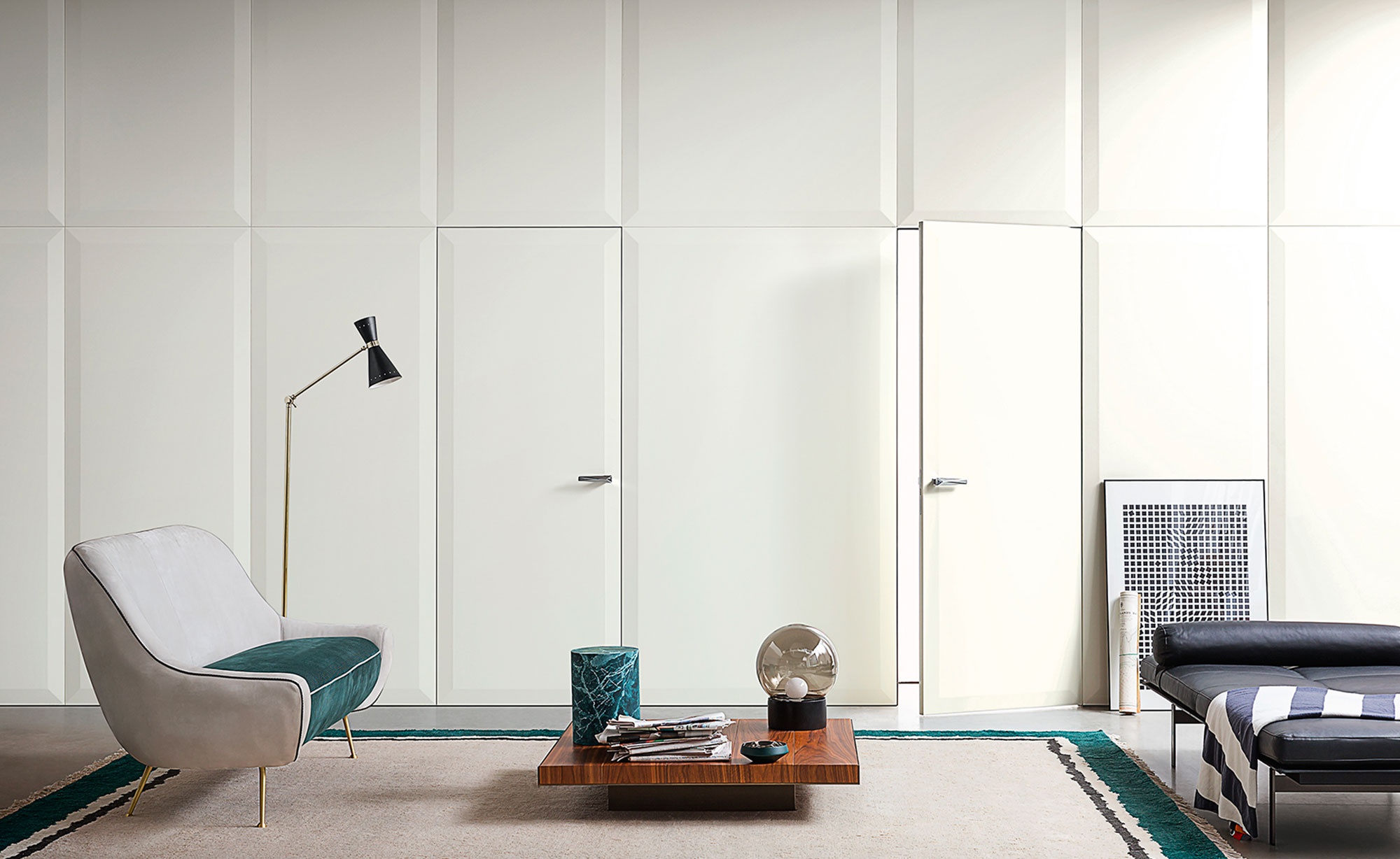 La gamma di finiture delle porte Lualdi comprende le più nobili essenze lignee, metalli e una paletta di colori laccati lucidi e opachi.