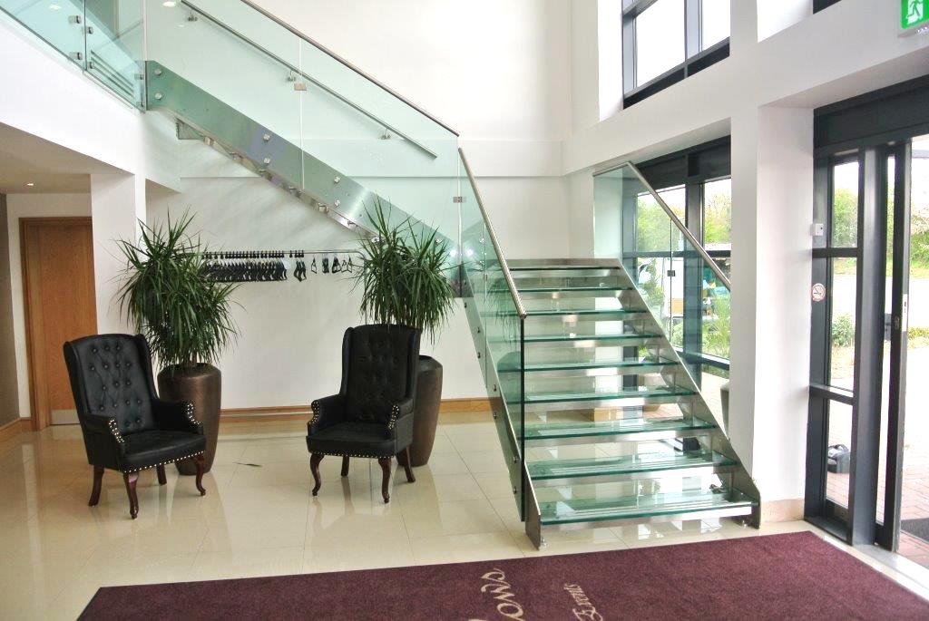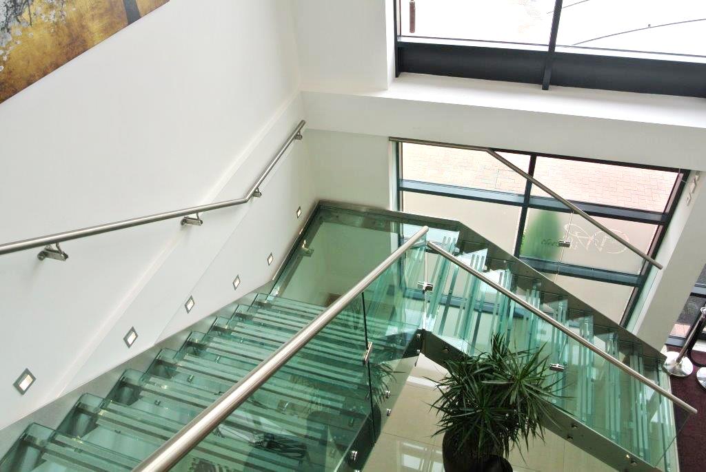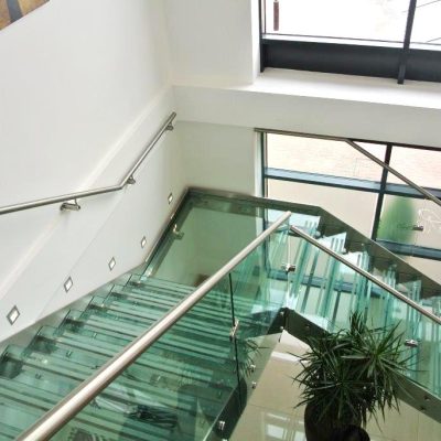 I gradini sono fissati alla struttura tramite un apposito sistema di staffe interne avvitate o su richiesta saldate. I gradini sono in vetro temprato e stratificato 8+8+8 mm di spessore.