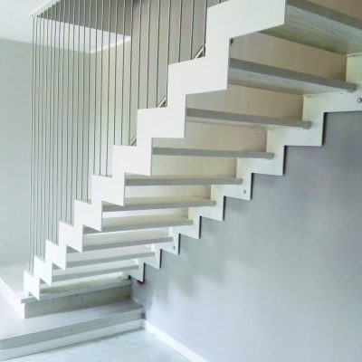 La ringhiera composta semplicemente da soli tondini verticali di diametro ø 8 mm a tutta altezza, è disponibile verniciata o in acciaio inox, fissata sul gradino e sotto soletta. Questa particolare ringhiera richiede specifiche situazioni del vano scala.