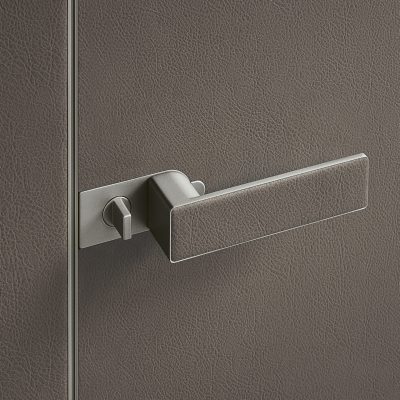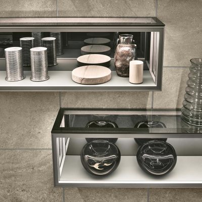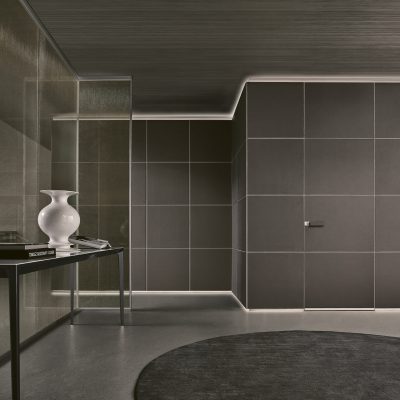 Dall’area disimpegno rivestita in similpelle argilla a quella centrale a doppia altezza in litech.