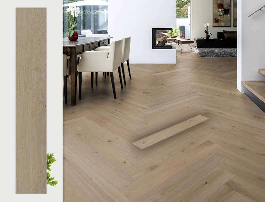 Il parquet a spina di pesce Ter Hurne si contraddistingue per il suo imponente formato da 1082x162x12 mm, che consente un modello di posa maestoso.