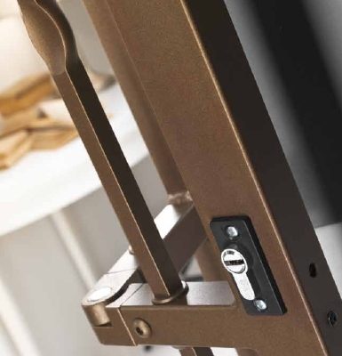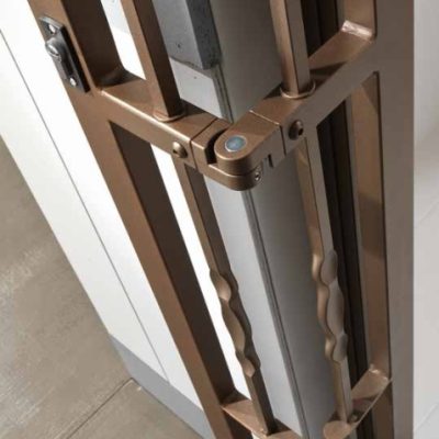 La versione PCS 180 è dotata di un particolare snodo, che ha una doppia funzione, in apertura di ribaltare l’anta completamente verso l’esterno, in chiusura di autobloccarsi con il telaio tramite un perno d’acciaio carbonitrurato, offrendo ulteriori punti di ancoraggio antistrappo; inoltre tramite lo snodo otteniamo una totale apertura anche verso l’interno del locale, rendendo agevole l’operazione di chiusura della spagnoletta della persiana o antone.