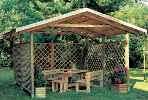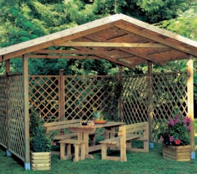 La pergola, di profondità 450 cm è formata da 6 pilastri, 3 capriate ed arcarecci trasversali. L’estensione di profondità 180 cm è formata da 2 pilastri, una capriata e arcarecci. Ogni estensione aumenta la lunghezza di 180 cm rispetto a quella della pergola. Pergola ed estensione possono essere gratuitamente modificati alle misure minori desiderate. La pergola può essere completata con grigliati, frangivento e pareti dogate.
