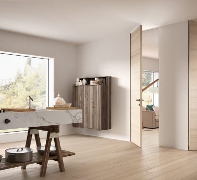 La porta Biverso presenta cerniere a bilico ed è disponibile nelle seguenti finiture: tinteggiabile, laccata bianca, laccata RAL, in legno nelle diverse essenze di rovere.