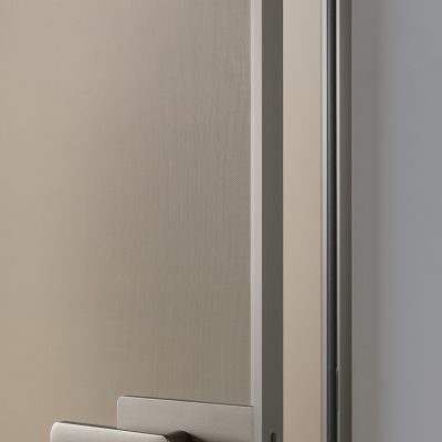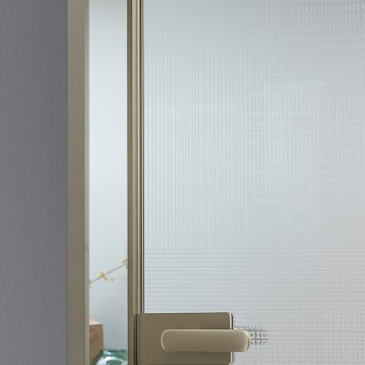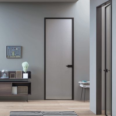Di linea nitida ed essenziale, questa porta di design si presta ad arredare gli ambienti più diversi grazie a una scelta di finiture che giocano con la luce e le trasparenze del vetro e la sofisticata eleganza del metallo.