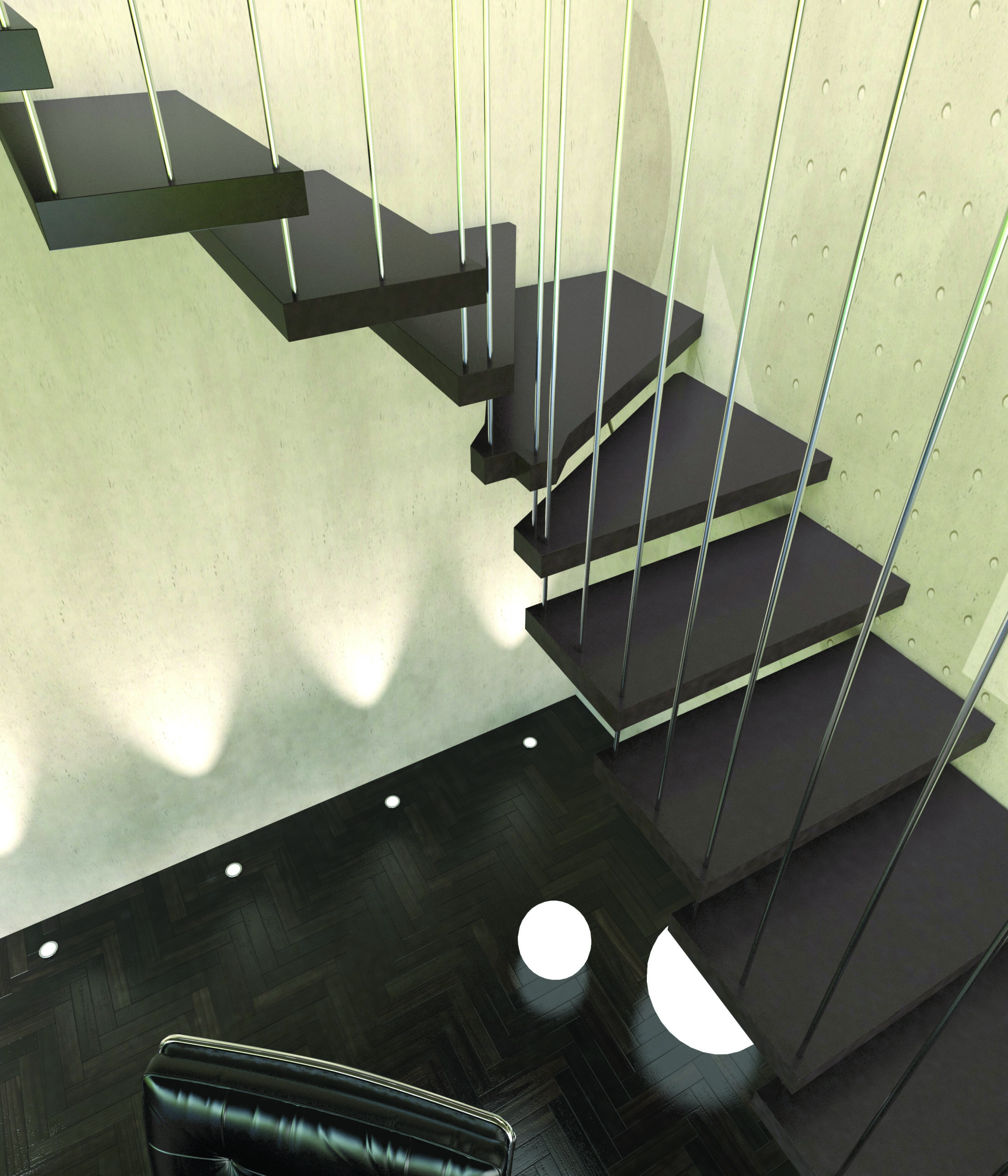 Swing si presenta con gradini a sbalzo fissati direttamente nel muro, disponibile anche nelle versioni con struttura laterale di sostegno in ferro verniciato o acciaio inox.