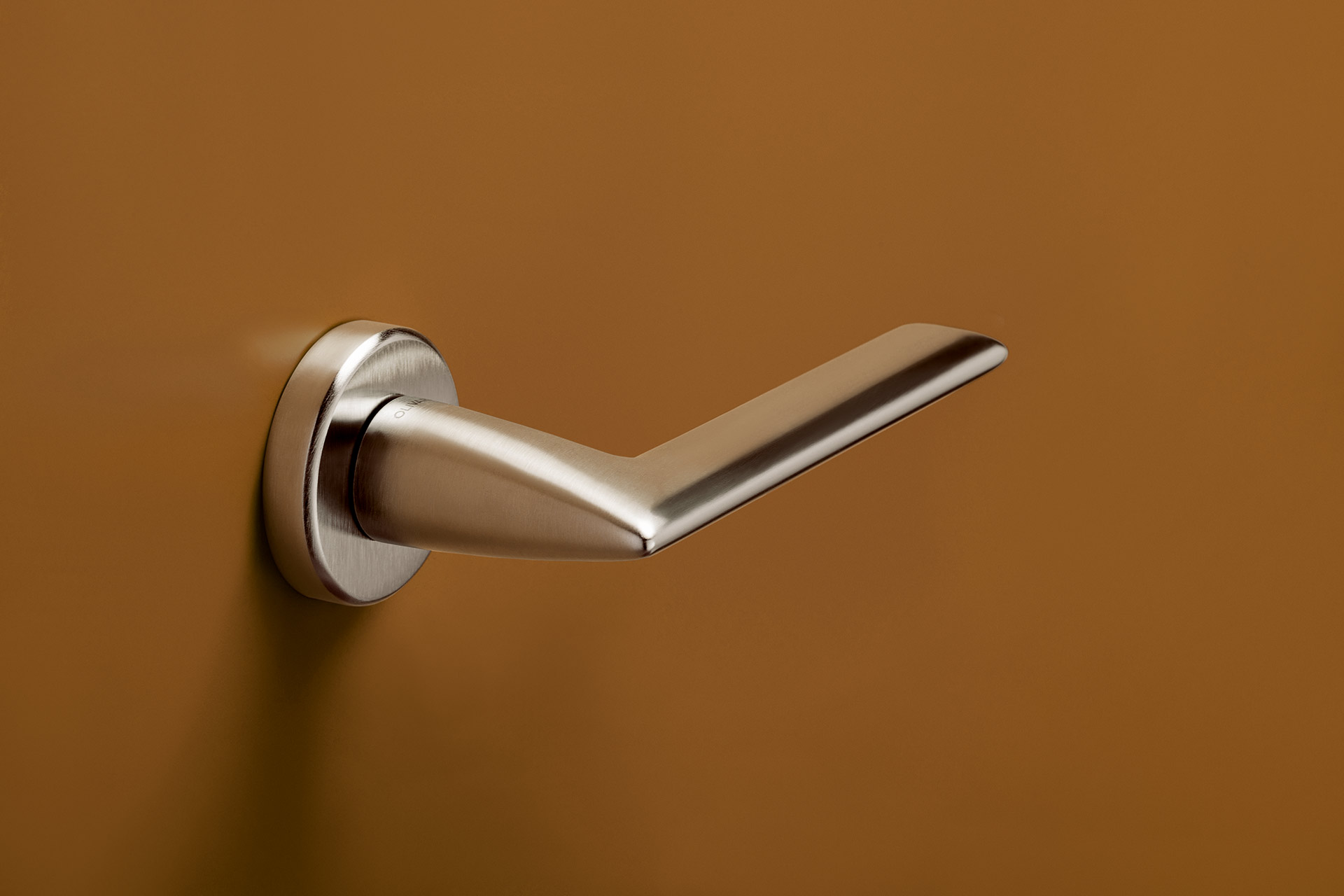 Nel disegno della maniglia Tecno, gli elementi in gioco si raccordano alla ricerca di minimo spessore possibile seguendo una linea filante.