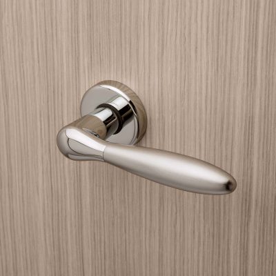 La linea di separazione e l’abbinamento di due finiture permettono di far apprezzare ancora di più la forma della maniglia.